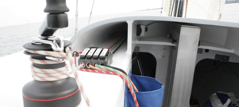 The clean unbroken lines dominate the deck of the blu30. As far as possible the sheets and halyards are led under deck to the two winches. By leading the sheets and halyards in this manner the cockpit stay free of ropes, allowing for easy and save short crew and single handed sailing.